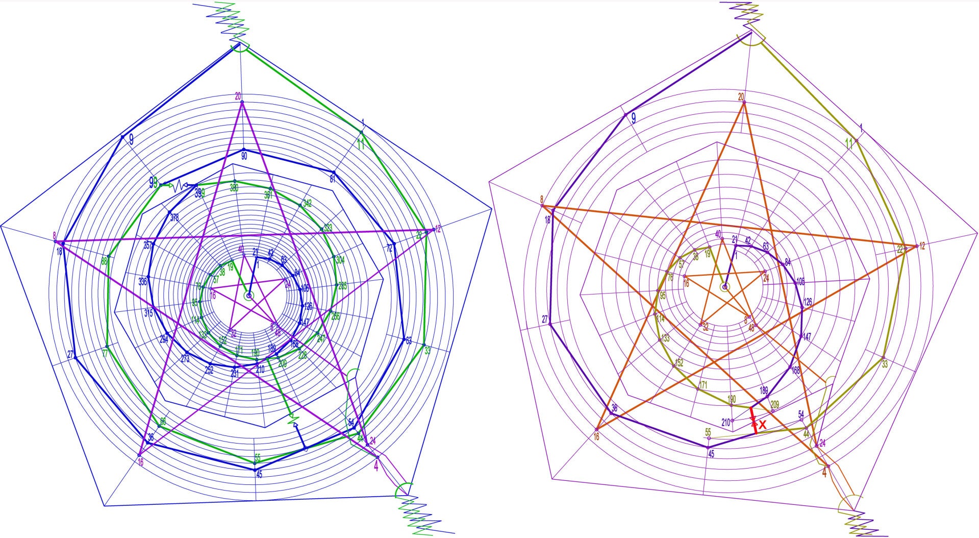 Hier unten-rechts (violett-braune Grafik), die beiden oberen Toroiden-Diagramme nochmal, in einem Stück, als eine detailliertere Darstellung. Die linke-untere Grafik (blau-grün) stellt denselben Toroid, jedoch im gesunden Zustand dar. Vergleiche die beiden unteren miteinander: Vor dem erreichen der Zahlen 209 und 210 (und 54, 55, also der symbolischen "56") durch die energetischen Bögen, kommt es im rechten, unteren Diagramm zu einem dauerhaften Kurz-Schluss/ "Orgasmus"; rot, und mit einem "X" markiert. Der weitere Lauf der Bögen wird dadurch unterbrochen und durch den erzwungenen Zusammenschluss der beiden Bogen-Herzen, kommt es zur "Ehe"/ zur Versklavung des Toroids/ der lebenden Entität. Das "X" Symbol hat mehrere Bedeutungen, doch sie alle sind genau darauf zurück-zu-ziehen. Egal, ob Du dieses "X"-Symbol im Zusammenhang mit einem, an dem "X" gekreuzigten Menschen siehst, oder ein Vatikan-"P" mit dem "x" am langen Bein (totales PLUS/ +, totale Erdung), oder von dem "Planeten X" etwas liest.